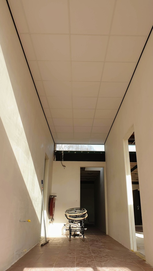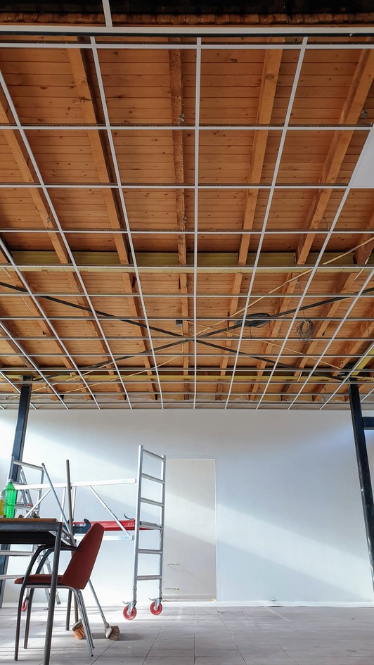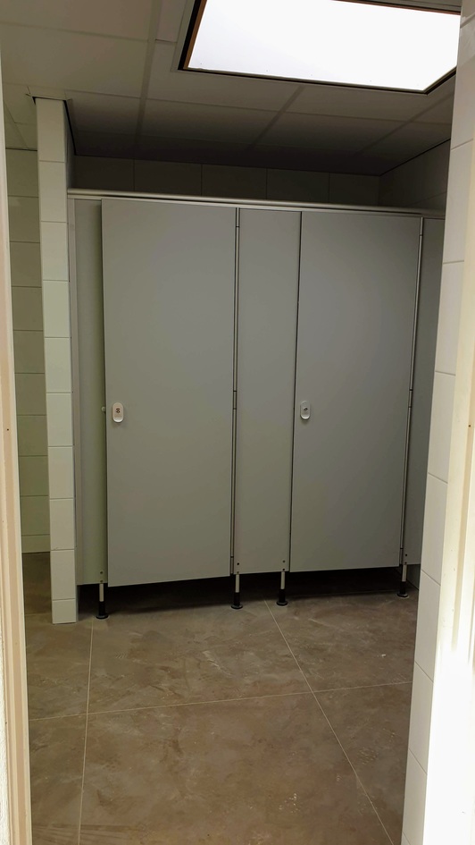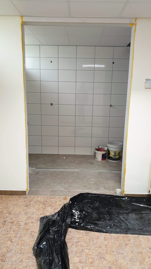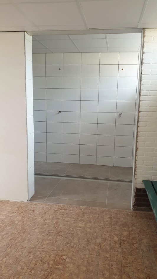 Afgelopen week heeft de aannemer het plafond in de dames- en herenkleedkamer en nieuwe gang geïnstalleerd. In de kantine zijn de voorbereidingen voor het nieuwe plafond getroffen - hier is het raamwerk geplaatst. Ook zijn de toiletten en toiletcabines geplaatst. Alle tegels zijn inmiddels ook aangebracht. Tot slot is er een begin gemaakt met de nieuwe entree.